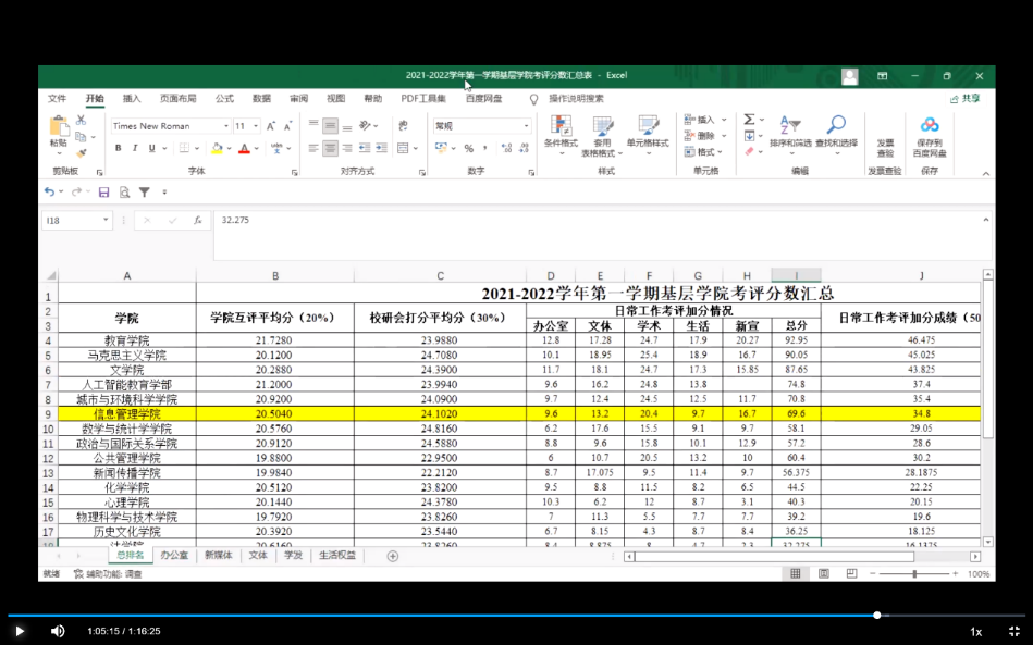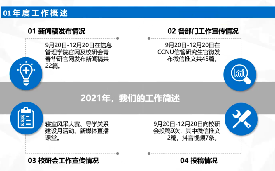 新媒体中心部长张宁就学院活动的宣传、学院官网发稿情况、微信公众号运营、积极配合校研会新媒体宣传等活动成果进行了工作总结,量化展示了新媒体部门干部的工作成果,肯定了每位干部的辛勤付出,特别感谢指导老师,主席团以及各部门提供的支持和帮助。她总结了部门在新闻稿写作与校研会投稿两方面上存在的进步空间,提出下一阶段工作改进目标:进一步磨练写作能力,提升短视频拍摄剪辑水平,创新形式与内容。并表示将争取在下学期取得更好的成绩,为同学们提供更满意的服务。