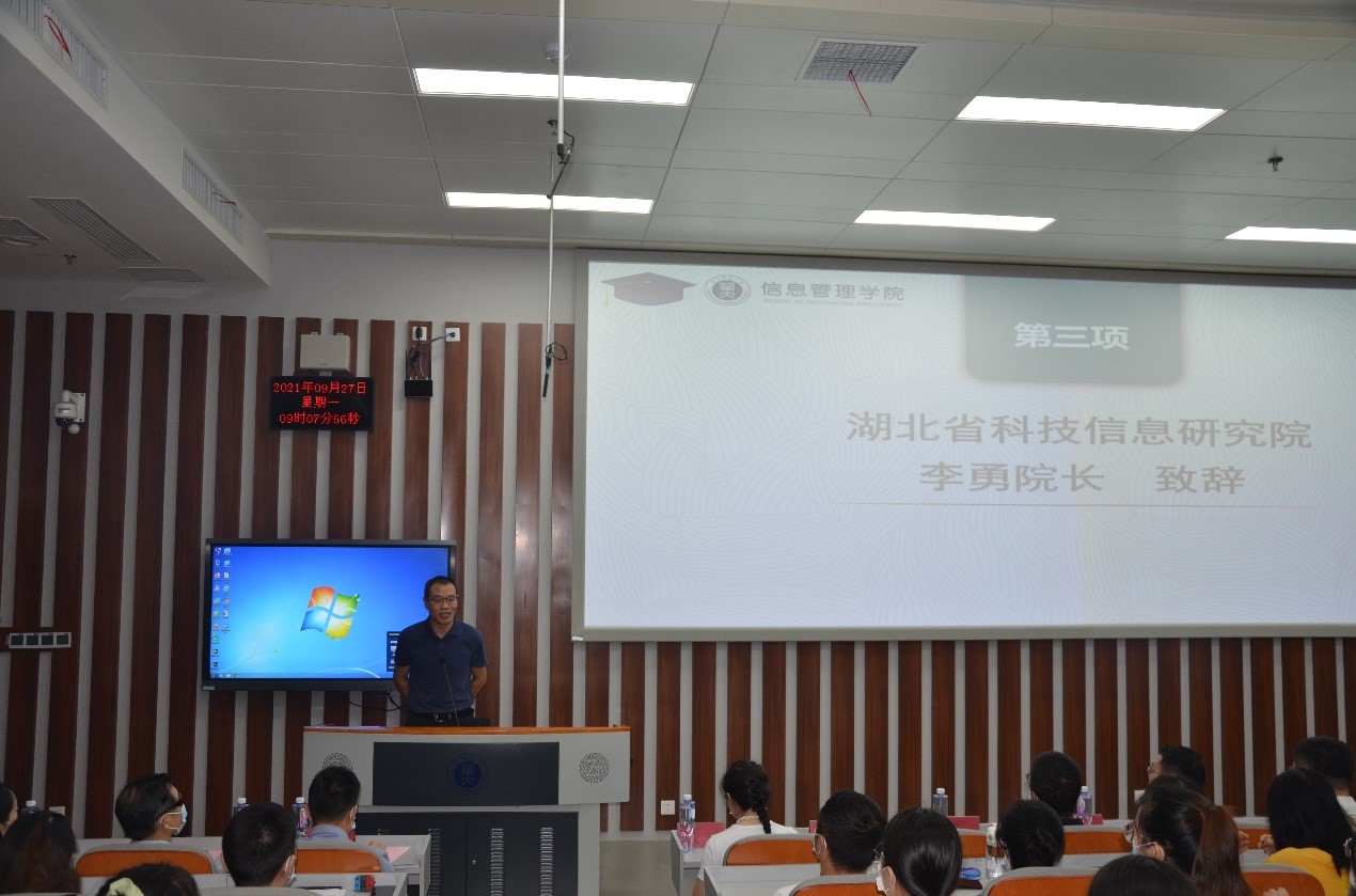 典礼第三项,湖北省科技信息研究院李勇院长致辞。作为华师信管院昔日的一名学子,李勇院长表达了回到母校的激动之情。同时,他以“服务于科技发展,助力创新驱动”为主题,从研究重点、研究人员、科研项目等方面介绍了湖北省科技信息研究院的主要情况。李勇院长向新同学发出倡议,希望同学们积极参与产学研一体工作,积极打造湖北省科技智库品牌,并欢迎大家来到湖北省科技信息研究院交流学习。