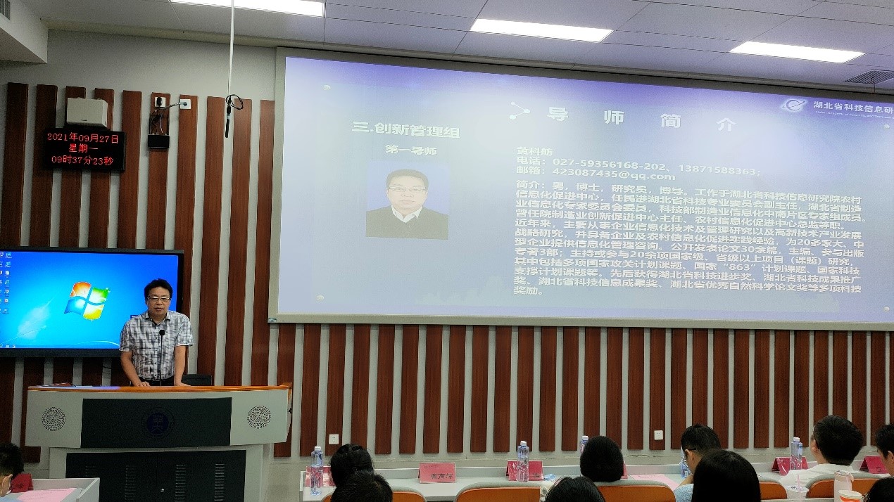 典礼最后,曹高辉副院长对各位出席领导、来自湖北省科技信息研究院的各位研究员表示了诚挚谢意。同时为研究生新生介绍了硕博培养流程,讲解了学院组织架构、学科专业、师资力量、科研项目等方面内容,让大家对信管学院有了更多更深入的了解。最后,曹高辉老师鼓励大家刻苦学习,以科研为重,从而能够在研究生阶段取得学术上、生活上的突破进步。
