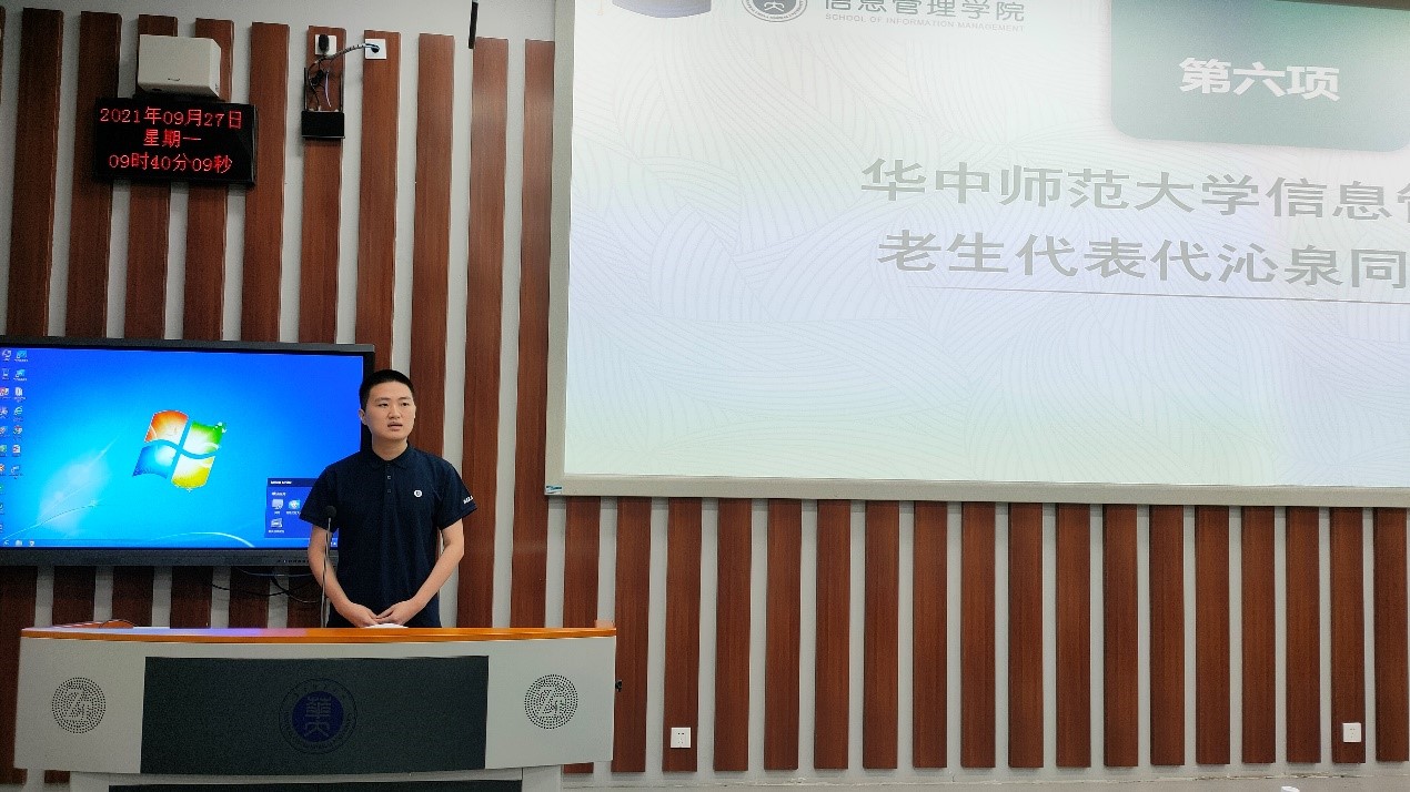 典礼第六项,信息管理学院老生代表2019级情报学专业代沁泉学长发言。代同学对新生的到来表示热烈的欢迎与诚挚的祝福,并且分享了自己在研究生阶段宝贵的学习经验。同时希望各位同学能够志存高远,心存家国,用理想和担当书写人生篇章。在培养科研精神人文精神的过程中,博采众长,厚积薄发,相信自己,一切皆有可能。