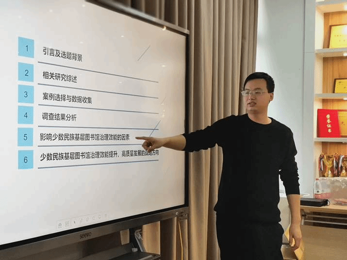 紧接着,博士生马永强、石乐怡、石庆功、郑卓闻、孟璇、涂秋阳也积极分享了自己的观点与经验。第一位来自武汉大学的马永强博士针对“文言文翻译”这一困扰许多人的问题,向大家介绍了自己的研究成果,通过几个案例详细展示了自建模型的原理、功能与优势。最后,他结合主题阐述了大数据对数字人文研究的重要性,强调了数据源可靠可信的重要性。第二位来自武汉大学的石乐怡博士针对信息素养教育、数据能力培养提出了自己的见解。她从更广阔的视角探讨了,在面对政府决策地情景下,图情教育应该如何培养学生能力,并提出图书馆以及各类图书情报机构所提供的服务应当更直接地服务于政府决策。第三位来自武汉大学的石庆功博士用脚步丈量祖国大地,他从自身实践谈起,向在场各位展示了关于“少数民族基层图书馆治理研究”的最新成果。他强调,在办公室里分析数据是远远不够的,只有行万里路,深入基层寻访,才能真正发现行业存在的最真实的问题。第四位来自华师的郑卓闻博士紧扣“数智时代”的沙龙主题,从“开放数据的价值实现”谈起,分享了他对于全生命周期数据融合共享的想法。第五位来自华师的孟璇博士首先分享了他对“数智时代”大数据与人工智能之间关系的理解,其次总结了当前环境下情报学研究的问题与机遇,分别从如何拓展图情领域的素质拓展教育、如何更广更深地嵌入本领域的科学研究、如何更积极主动地推进图情领域与国家战略的对接这几个方面展开了探讨。第六位来自华师的涂秋阳博士从管理科学的角度出发,融合信息驱动等要素向在座各位讲解了自己的最新论文成果。