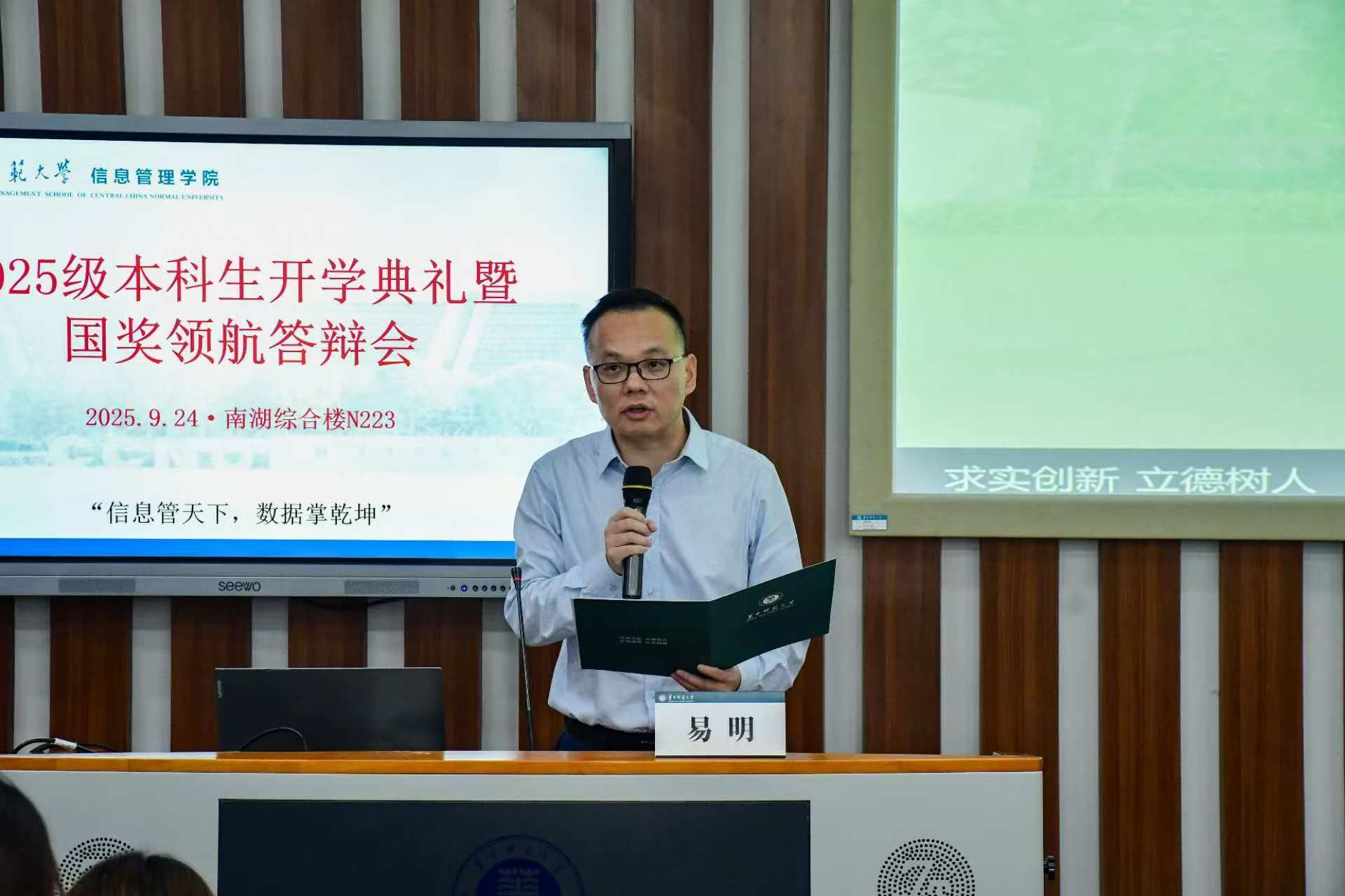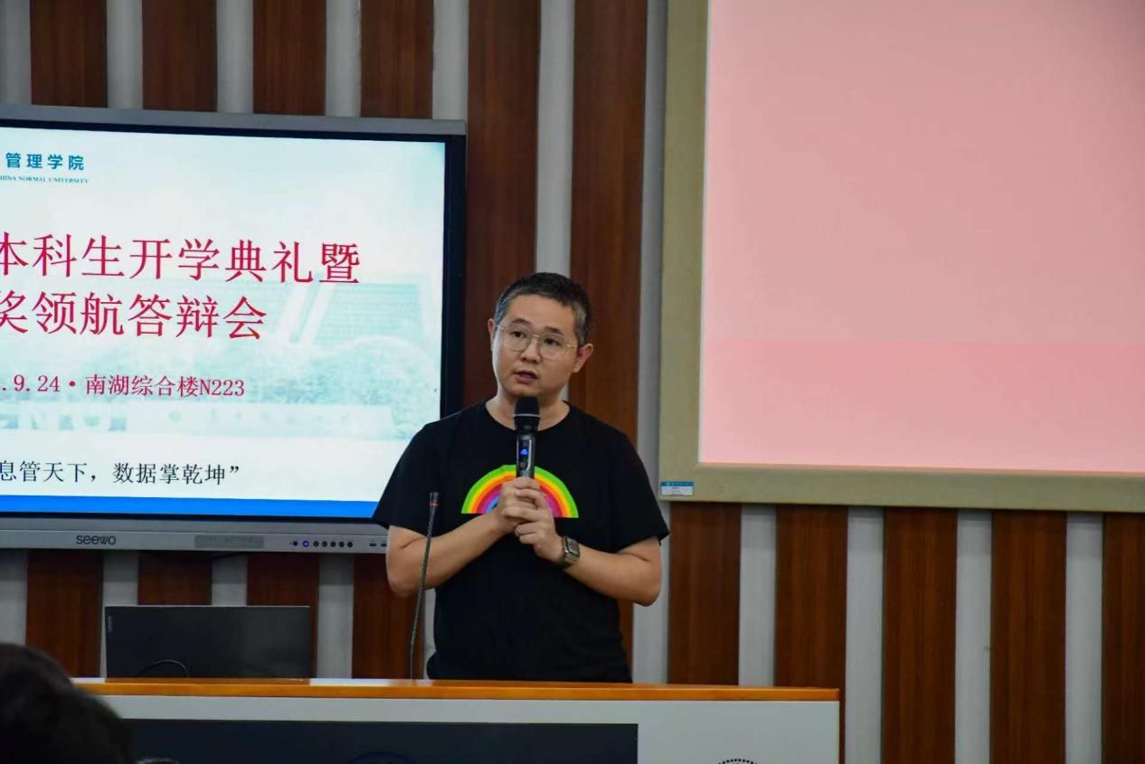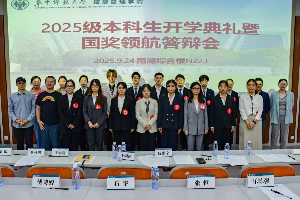 华大青年讯(通讯员 潘忻宏 刘莹)9月24日下午,信息管理学院2025年本科生国奖领航答辩会在南湖综合楼N223举行。信息管理学院党委书记王雨露,院长曹高辉,党委副书记王涛,副院长翟姗姗,信息资源管理系党支部书记易明,大数据管理与应用系主任叶光辉,信息管理与信息系统系主任陈鹏宇,本科生班主任丁恒、石宇、乐陈强、王光超、王浩、傅诗婷、张恒,本科生专职辅导员蒋可鸣、王乐出席答辩会并担任评委。2024级学生高汇鑫作为主持人。2025级全体新生参会并学习观摩。