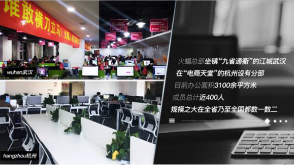 武汉火蝠电商始创于2014年,公司位于中部地区核心城市武汉,办公面积3200余平方米,员工总数近420人。是一家专注为品牌商家提供电子商务管理与咨询的服务企业。公司在创业之初就秉持专心、专注、专业的服务态度及"为客户创造价值"的宗旨,提供优质的多元化服务,依托火蝠服务商这个主体,裂变有新媒体、品牌孵化、品牌运营、品牌设计、五星客服、供货渠道、中央仓储、视觉摄影、电商培训、AI软件开发等业务板块,专注打造一个具有活力的电子商务生态链,帮助更多的品牌商家在电子商务方面取得成功。
