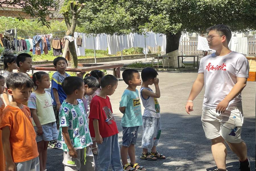 7月10日,一至三年级与四至六年级学生的第一节体育课准时开始,追光实践队队员刘坤华、李林担任本堂课的教学老师。在正式上课前,刘坤华按身高由低至高对学生们进行队形编排,并着重强调了体育课的纪律要求。第一项学习内容是稍息与立正,刘坤华耐心地教导学生们动作要领,学生们也在老师的指导下很快做出正确的动作。第二项内容是集合和解散,老师一声令下,学生们很快就有序地集合起来,当老师说“解散”时,学生们也能迅速作出反应。