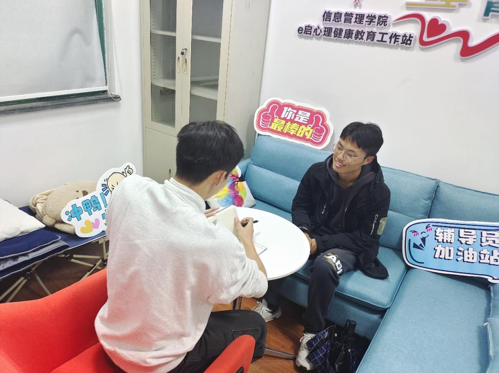 (通讯员 张柳萌 黄彦松 罗鸿奕)为了使辅导员更加深入了解22级新生学习生活情况,加强与新生的交流,帮助他们解决学习生活中的问题和困惑,以更加积极向上的姿态融入大学生活,由华中师范大学信息管理学院“e启心理健康教育工作站”和可鸣思政工作室主办的“辅导员加油站活动”由此开展。9月21日,第一阶段活动如期而至,辅导员蒋可鸣老师和兼职辅导员胡凯华老师同2022级新生刘浩然、黄绍博等同学展开了积极愉快的交流。