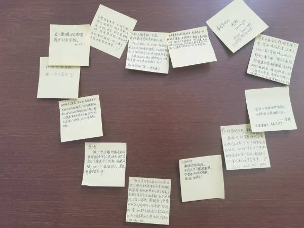 听完几位同学的分享后,同学们都对志愿活动深有感触,在便利贴上写下了自己的体会,也借此机会立下积极参与志愿活动,学习雷锋精神,义无反顾地投身祖国建设的决心。