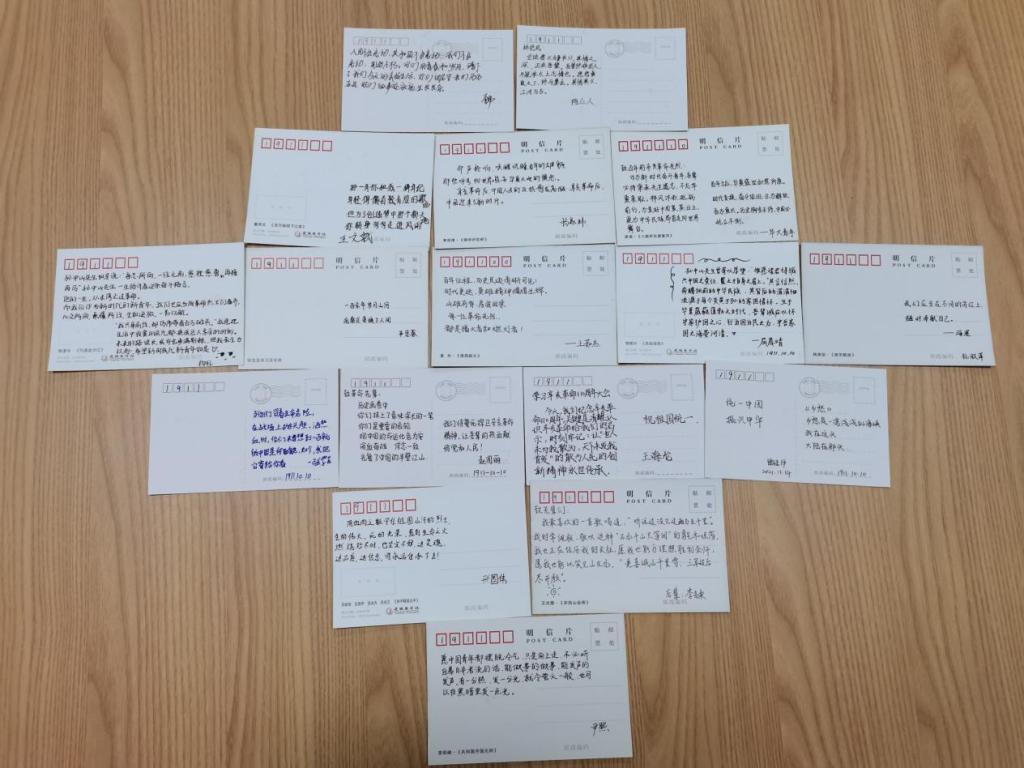 最后是跨时光书信环节。赵闺丽向大家分发了明信片,每位同学都写下了最想跨越时空向前辈们诉说的话语,表达了青春的理想和对前辈们的追忆、敬仰。