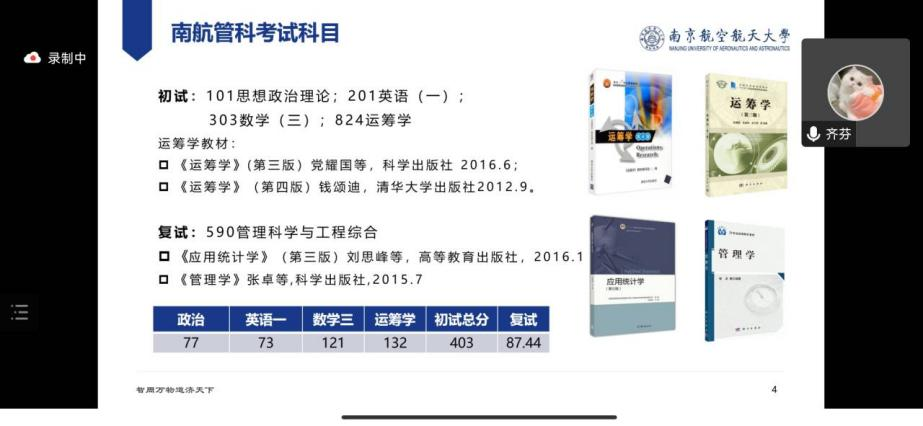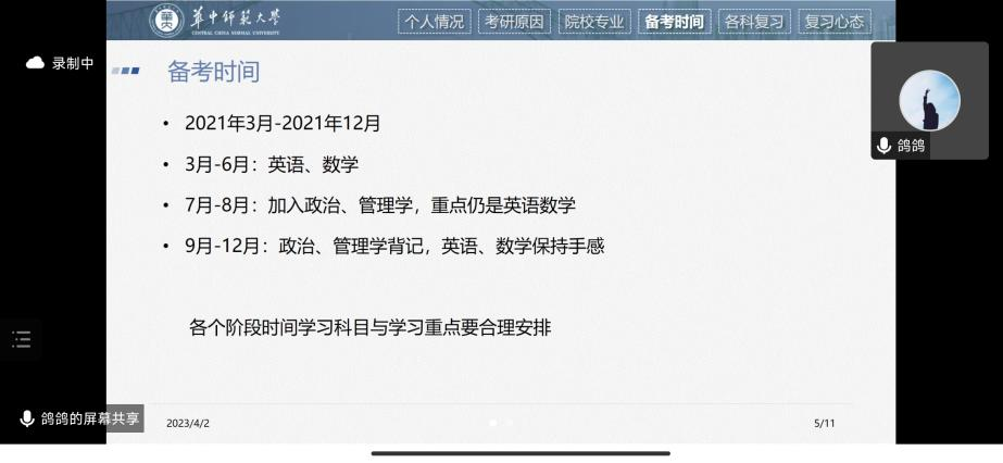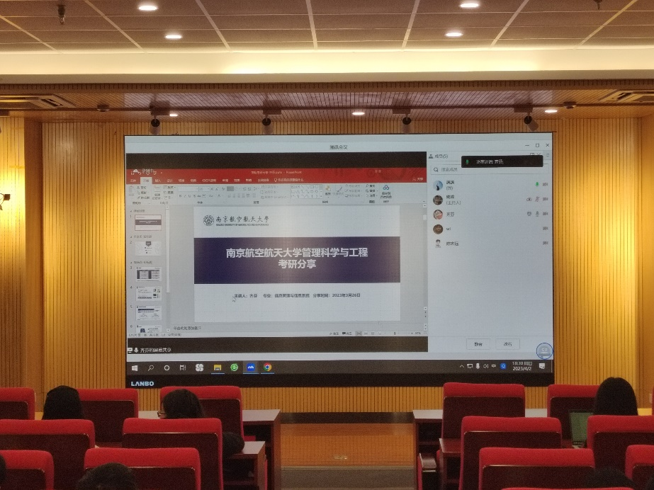 4月2日晚,信息管理学院2020级同学在N10001报告厅参加晚点名暨第一期考研经验分享会,该会由2020级兼职辅导员王乐带领开展。第一期考研经验分享会聚焦管理科学与工程专业,分别邀请2017级陈志远(北京理工大学)、2017级吴聘(华中科技大学)、2018级齐芬(南京航空航天大学)和2019级郑潇潇(华中师范大学)四位考研优秀学长学姐进行备考经验分享。