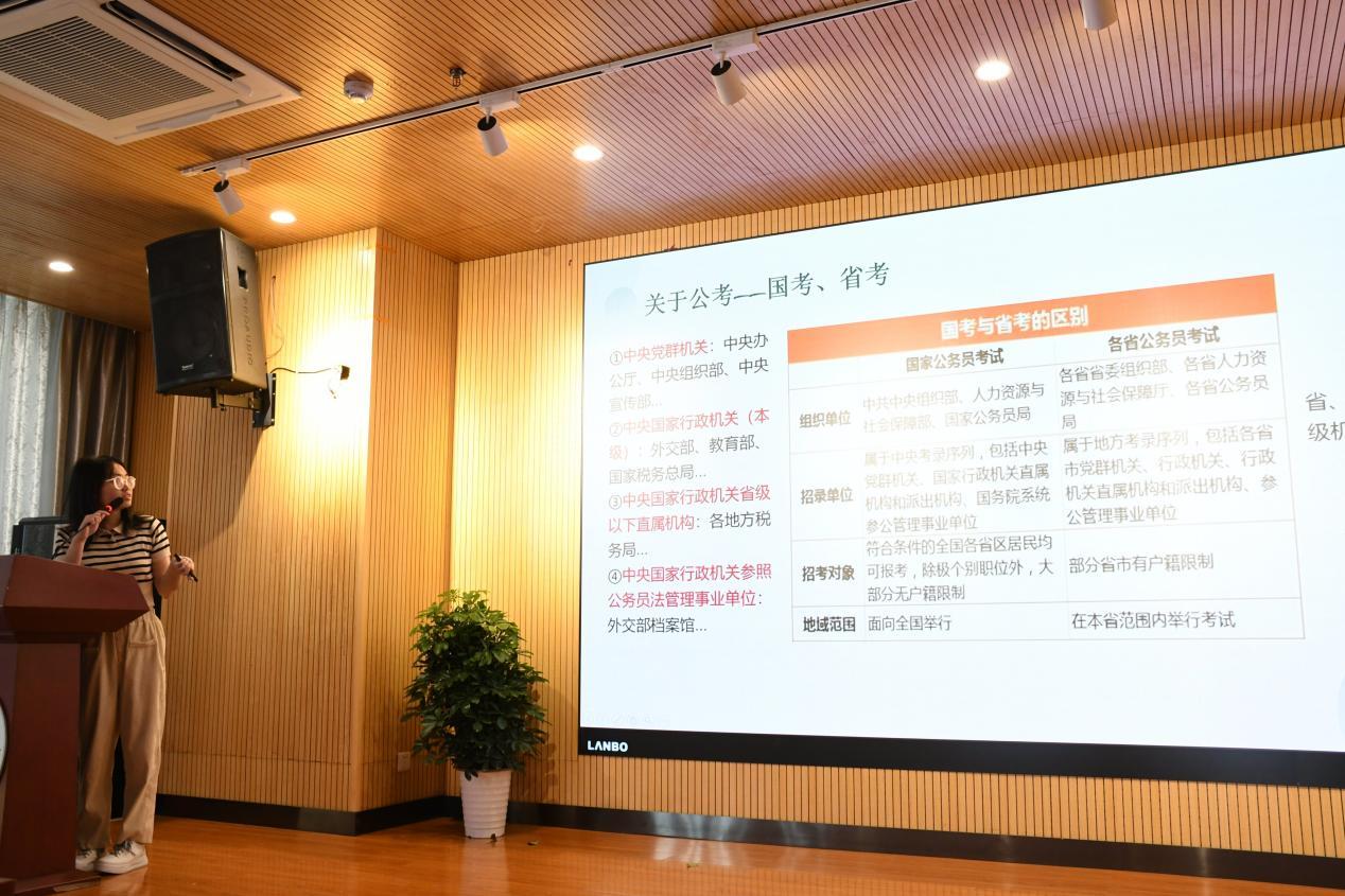 在分享环节中,学长学姐分别从就业、保研、考研三个方向向同学们分享经验,杨欣怡和张莉莉先分享了她们备考公务员的时间线和准备计划。杨欣怡说:“可以尝试网课与课本结合,学习新知识,进行实训和错题的巩固。”随后张莉莉详尽地为同学们介绍了报考公务员的条件、考试内容和考试流程,并结合自身经历分享了一些获取信息和调整心态的方法。张艳慧和何维蛟就自身找工作的经历向同学们介绍了完善简历的技巧和实习经历的重要性,并提供了一些获取就业信息的途径。