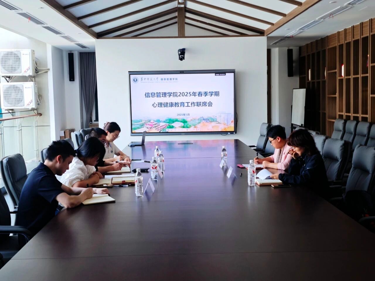 5月23日下午,信息管理学院2025年春季学期心理健康教育联席会议召开。学校党委学生工作部副处长吴建成、大学生心理健康教育中心指导老师袁丰卉、信息管理学院党委副书记王涛、学院本研全体专职辅导员参会。会议由王涛主持。