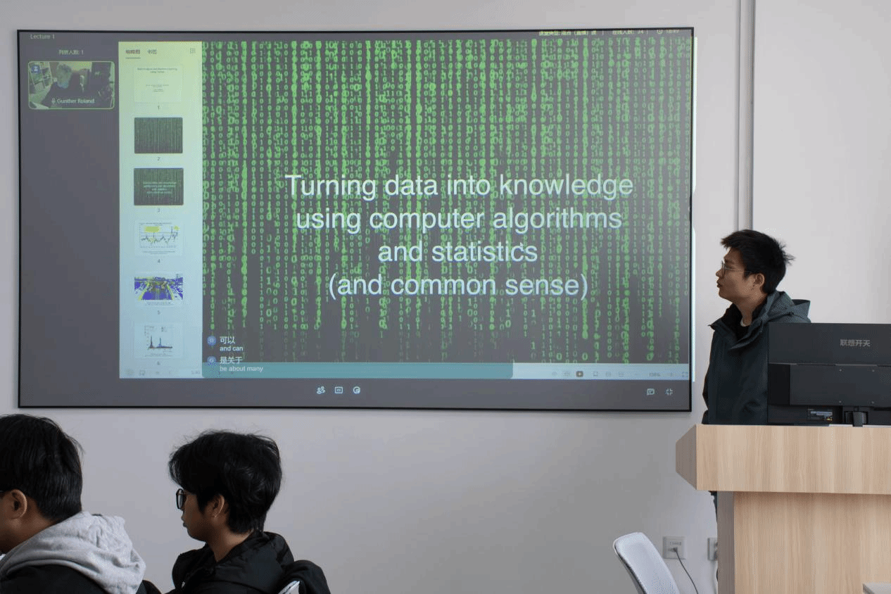 首堂课上,Gunther Roland教授从自身在高能物理领域的研究经验出发,向学生展示了数据科学在大型科学实验中的实际应用。他以欧洲核子研究中心的CMS实验为例,向学生阐释了数据科学的魅力与挑战。在介绍课程学习目标和方法时,教授强调,数据科学不仅仅是掌握编程技巧或统计学方法,更重要的是将两者有机结合,并具备对研究领域的深刻理解;